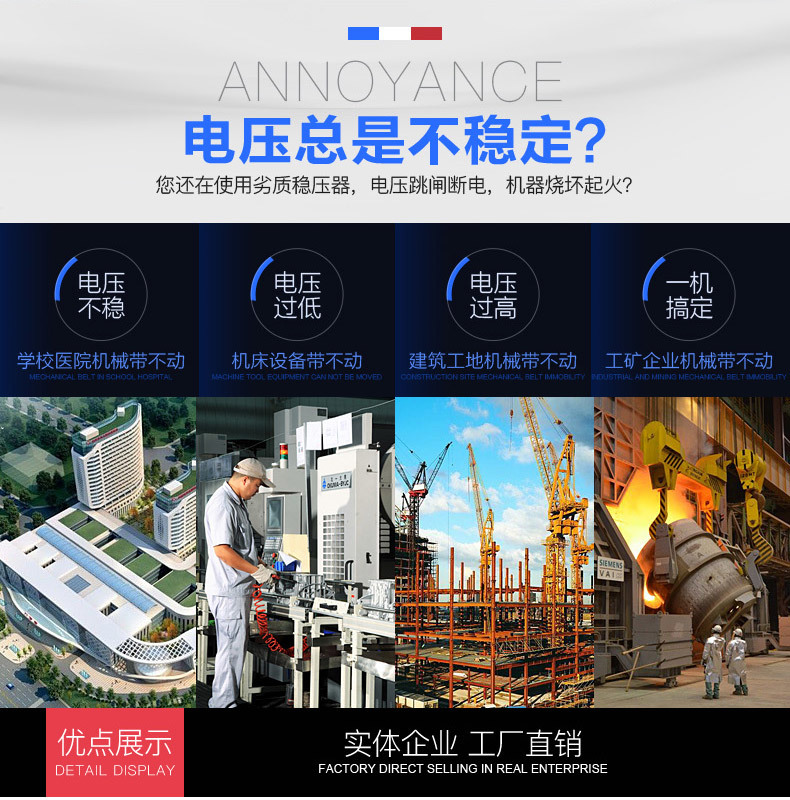 2.大功率補償式電力穩壓器:采用大功率柱式調壓器及大功率變壓器所以又取名大功率穩壓器,與第一款工作原理類似,也是通過電機帶動碳刷在銅柱上位置的移動,來達到調壓效果,再通過變壓器進行二次抗干擾及補償動作進行整改穩壓大部分過程,所有的動作檢測過程是通過智能電腦控制系統來完成的(這個功能創穩獨有研發),精度高,速度快。同第一款產品相比,具有功率大,壽命長,不易起高溫,保護系統更加完善。較適宜工廠、大型數控機床加工中心、進出口設備、激光切割機、鍍膜機、尿褲機流水線等大功率設備。